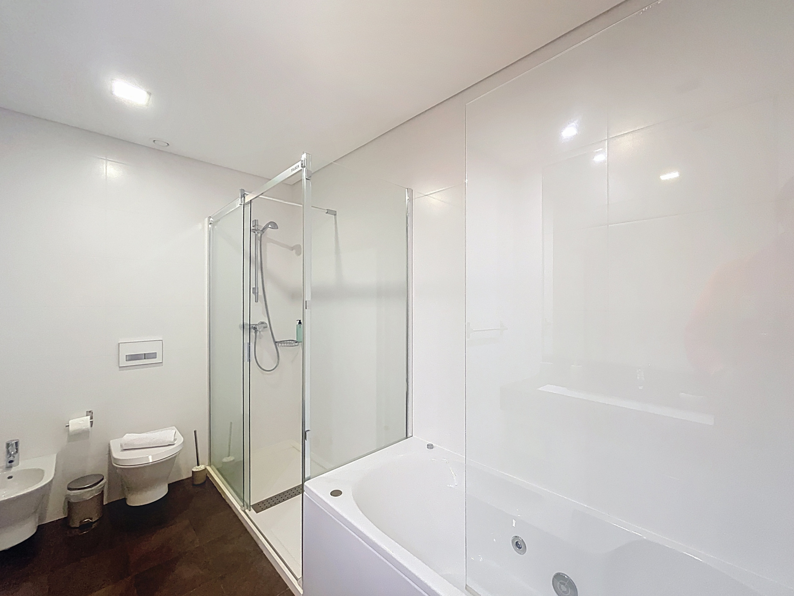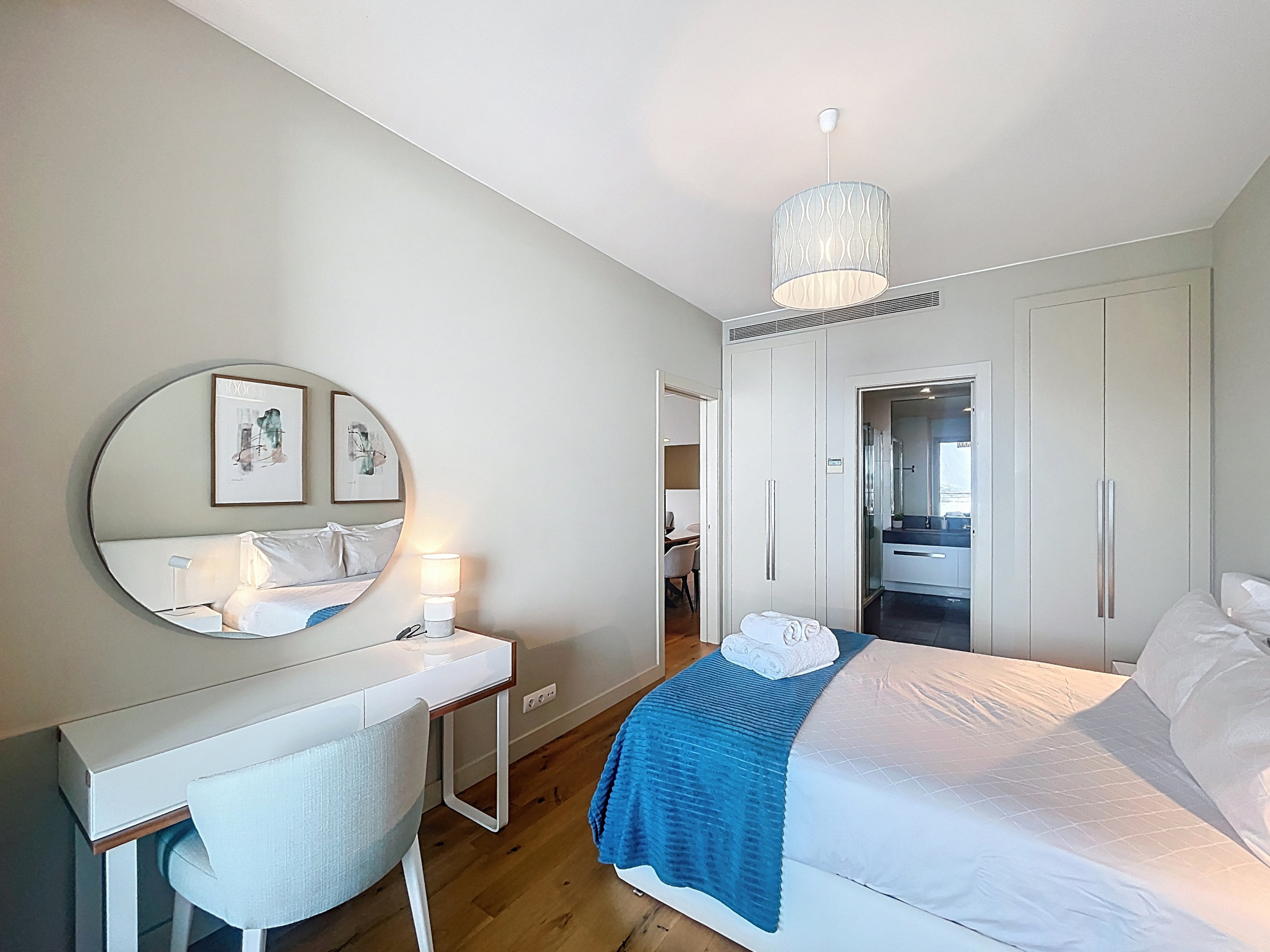 Die Wohnung verfügt über zwei Schlafzimmer, jedes mit einem Queensize-Bett und einem privaten Badezimmer en-suite, eines mit einer Dusche und das Hauptschlafzimmer mit sowohl Dusche als auch Badewanne. Ein zusätzliches Gästebad bietet Bequemlichkeit für den täglichen Gebrauch. Bettwäsche und Badetücher werden für alle Gäste bereitgestellt.