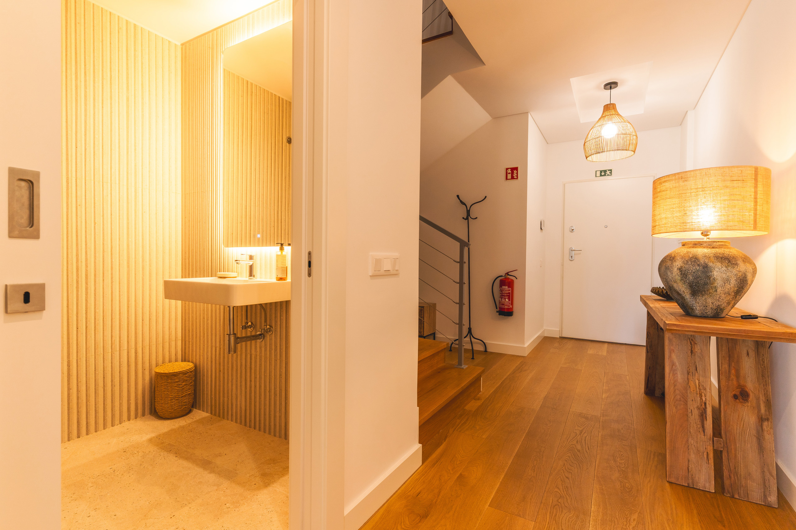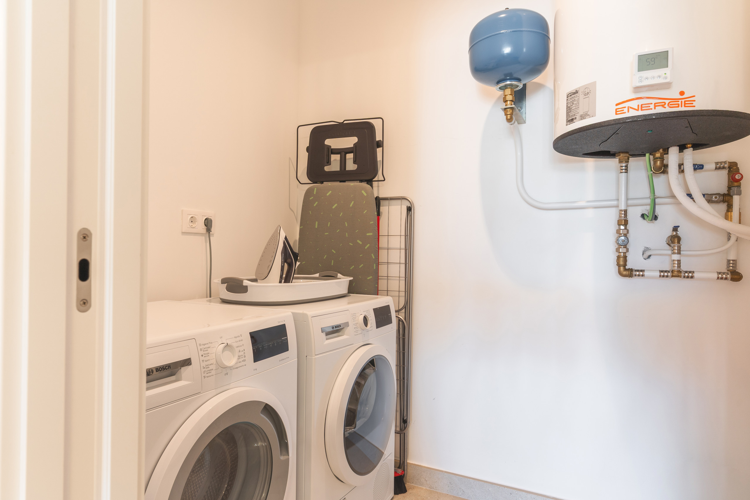 En la primera planta encontrará espacios acogedores para relajarse y comer, incluyendo un salón con smart TV y una cocina totalmente equipada con nevera, congelador, horno, microondas, placa, lavavajillas, cubertería, platos y todos los utensilios necesarios para cocinar. En la planta superior hay dos dormitorios: uno con cama de matrimonio (queen-size) y otro con dos camas individuales y un sofá cama doble. Cada dormitorio dispone de baño privado con ducha, además de un aseo adicional. Hay aire acondicionado y calefacción en ambos dormitorios. El apartamento también cuenta con lavadora, secadora, secador de pelo, cuna y trona.
