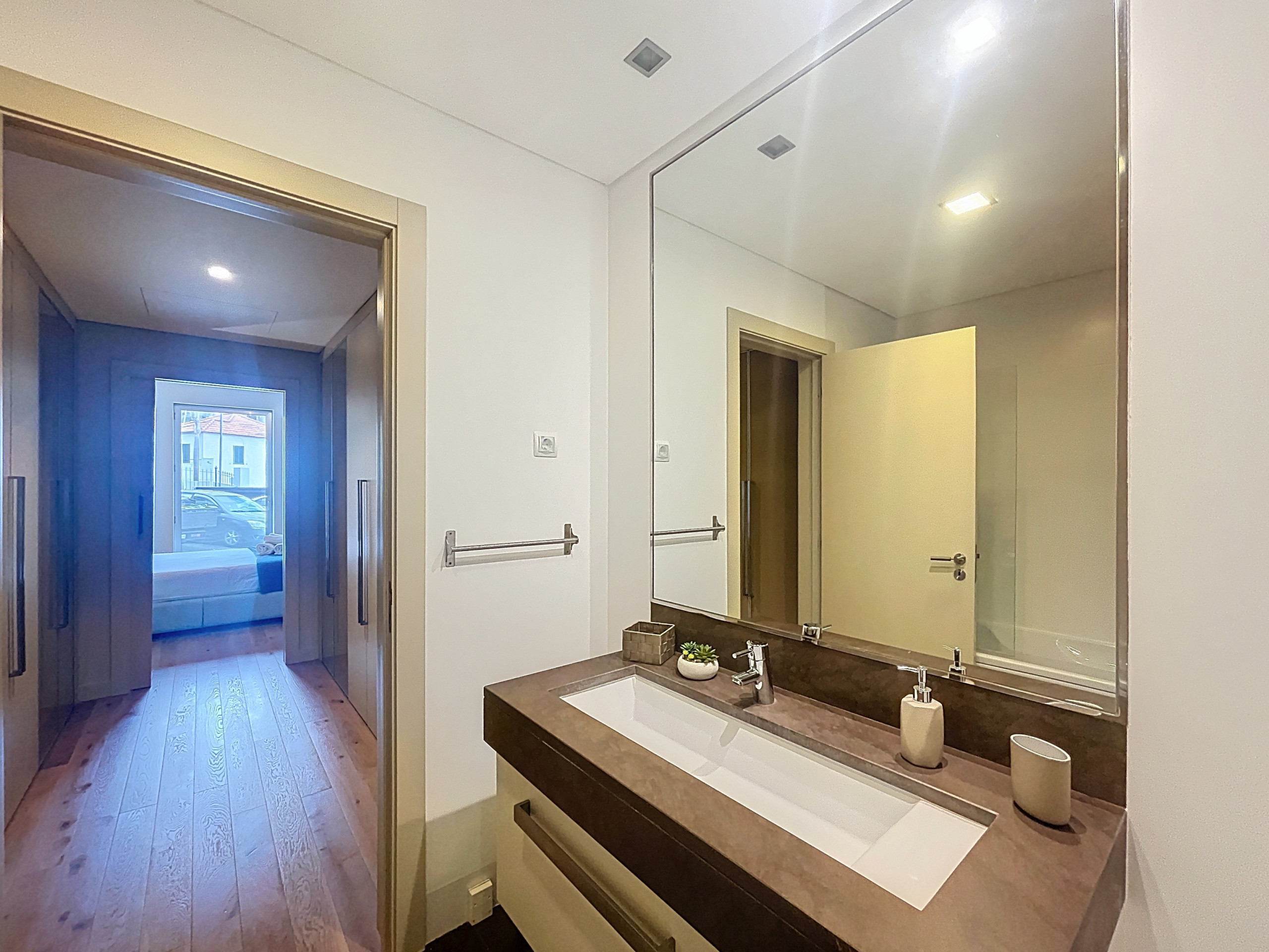 El apartamento cuenta con dos dormitorios, cada uno con una cama de matrimonio y un baño privado en suite, uno con ducha y el principal con ducha y bañera. Un baño social adicional añade comodidad para el uso diario. Se proporcionan sábanas y toallas de baño para todos los huéspedes.
