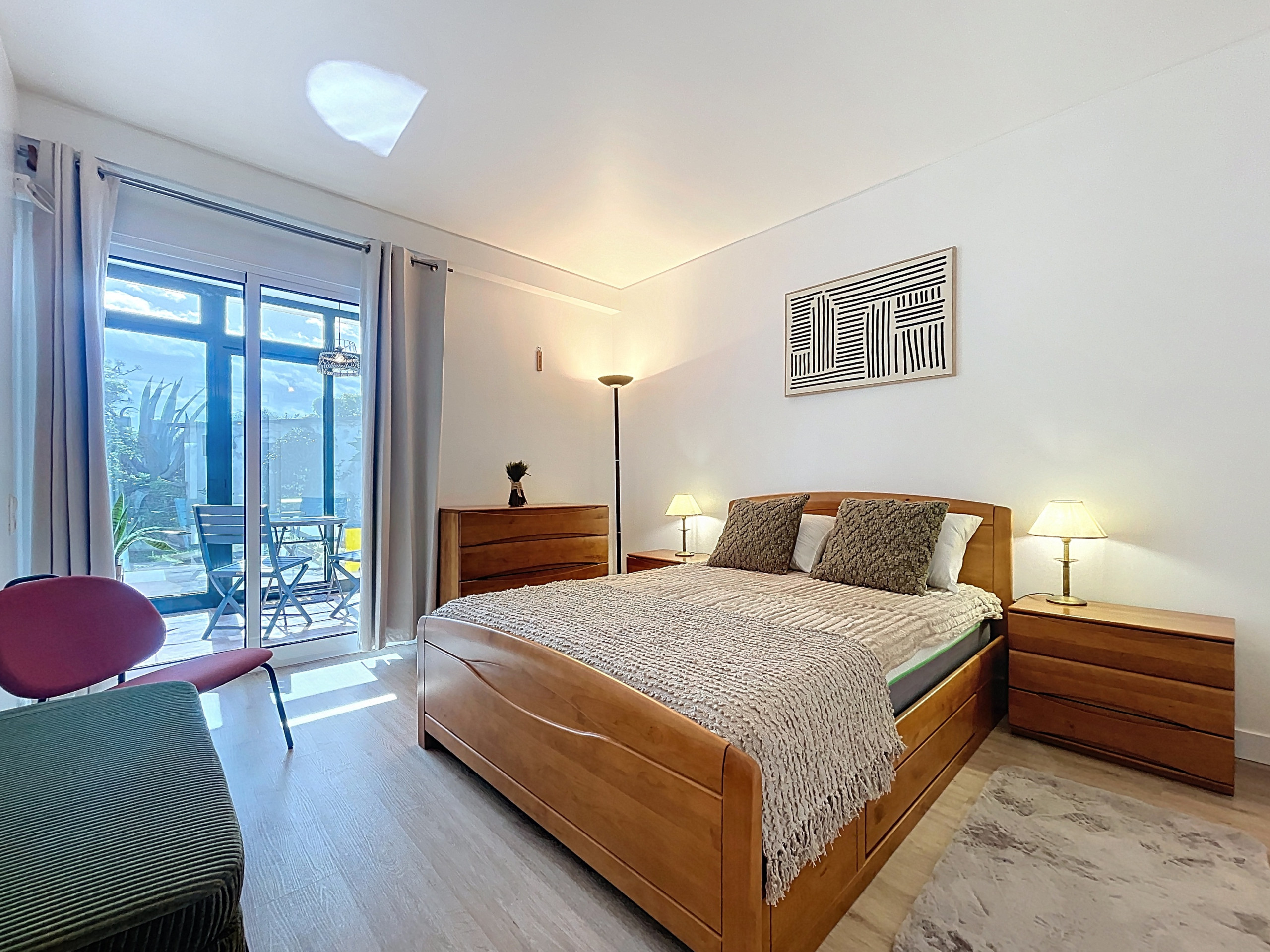 L'appartement dispose d'une chambre avec un lit queen size, garantissant un séjour reposant, et d'une salle de bain équipée d'une douche. Des draps frais et des serviettes de bain sont fournis pour votre confort. L'espace de vie est baigné de lumière naturelle, créant une atmosphère agréable tout au long de la journée.