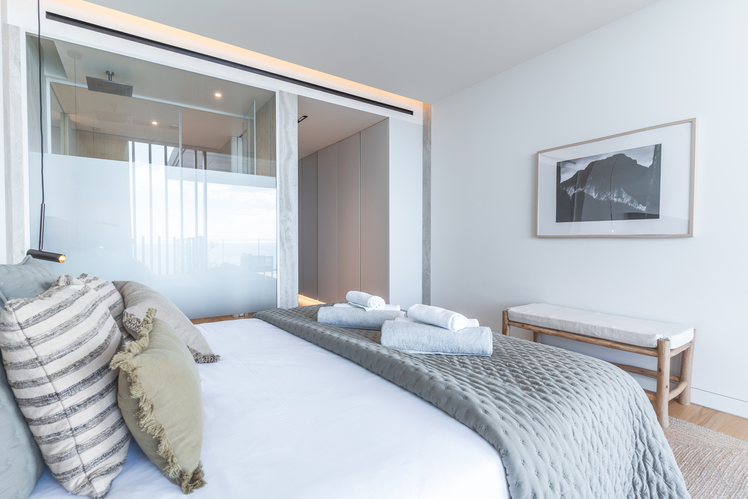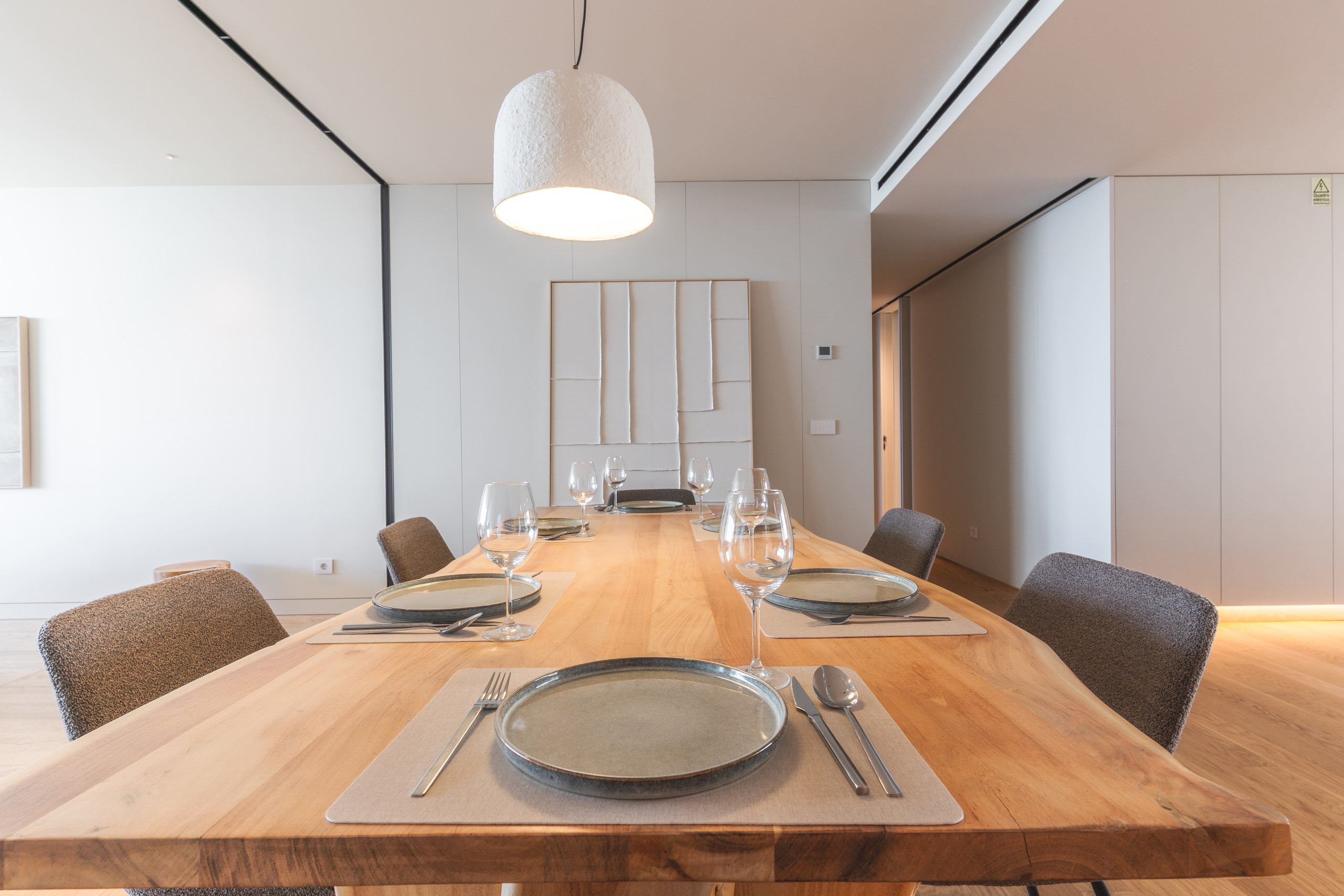 O apartamento inclui três quartos: um com uma cama de casal, outro com uma cama de casal e outro com duas camas individuais. Existem quatro casas de banho no total, três delas em suite, juntamente com uma casa de banho adicional para convidados, garantindo tanto privacidade como conveniência.