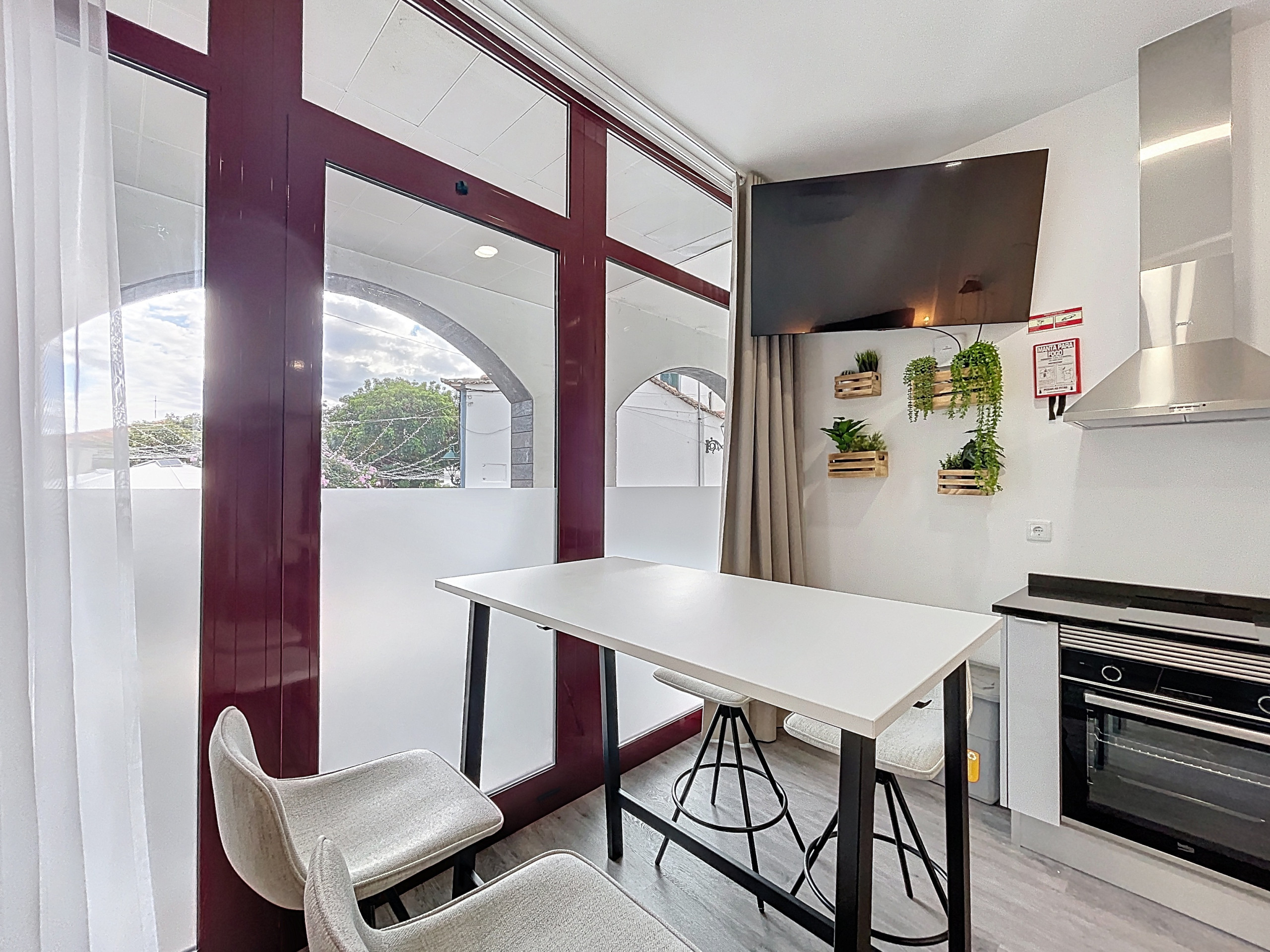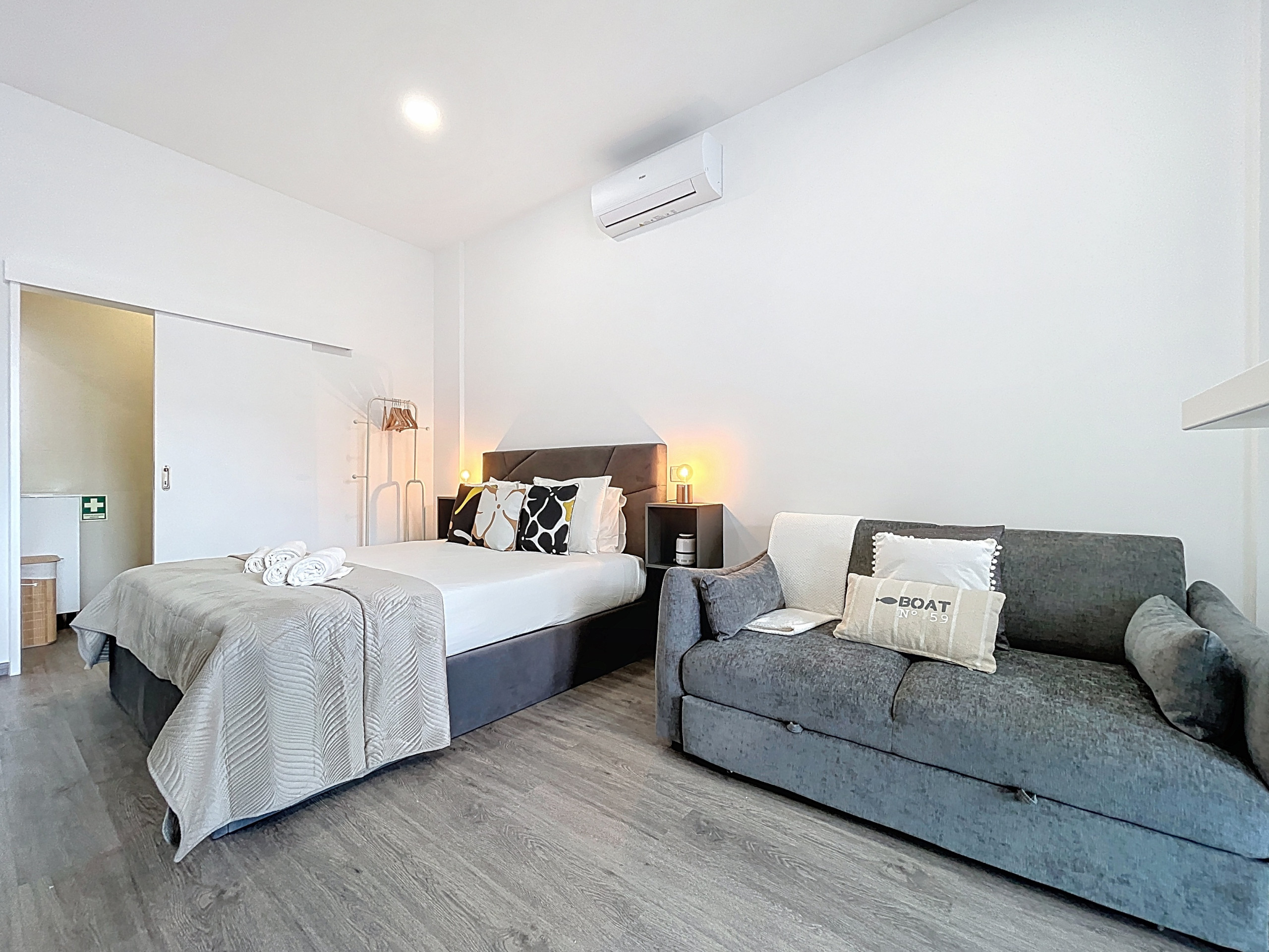O estúdio, em plano aberto, acomoda até três pessoas e dispõe de uma cama queen e de um sofá-cama para duas pessoas. A área de estar integra-se com uma cozinha totalmente equipada, que inclui frigorífico, congelador, forno, micro-ondas, placa e todos os utensílios necessários para preparar refeições. A propriedade conta ainda com uma casa de banho com duche, máquina de lavar roupa, secador de cabelo e Smart TV com box. Para famílias, disponibilizam-se berço e cadeira de bebé.